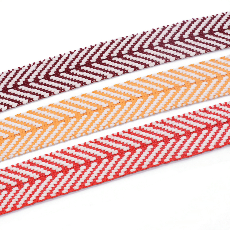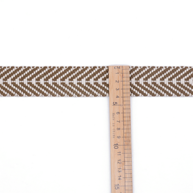 High Quality Jacquard Trims for Bags and Shoes. These 3cm trims are made of polyester cotton blend. Certified by Oeko-Tex, ensuring safety and quality. The geometric design in herringbone style adds a touch of elegance and modernity. Ideal for enhancing the look of bags and shoes, whether it's for a stylish handbag or a trendy pair of footwear. Durable and well-crafted, these trims are a great choice for fashion forward designers and manufacturers. They can be used to create unique and eye-catching details, making products stand out in the competitive market of accessories.